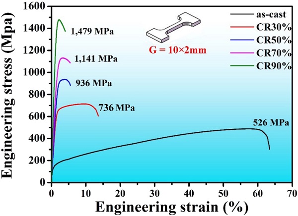 (b) 以延展性下降为代价,冷轧极大地增加了屈服强度和断裂强度。其中平衡性最好的一组结果为形变量30%时,屈服强度691MPa,抗拉强度736MPa伸长12.5%;