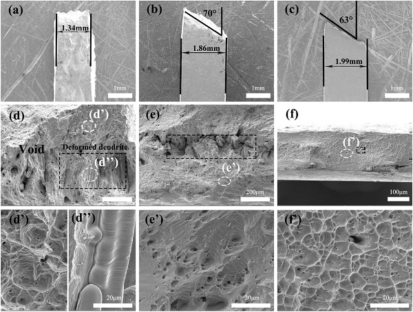 (d-f) 铸态以及50%,90%轧制量时断口表面俯视图;表明经过轧制,孔隙率降低,缩孔减少,断裂模式为塑性断裂中典型的韧窝断裂;