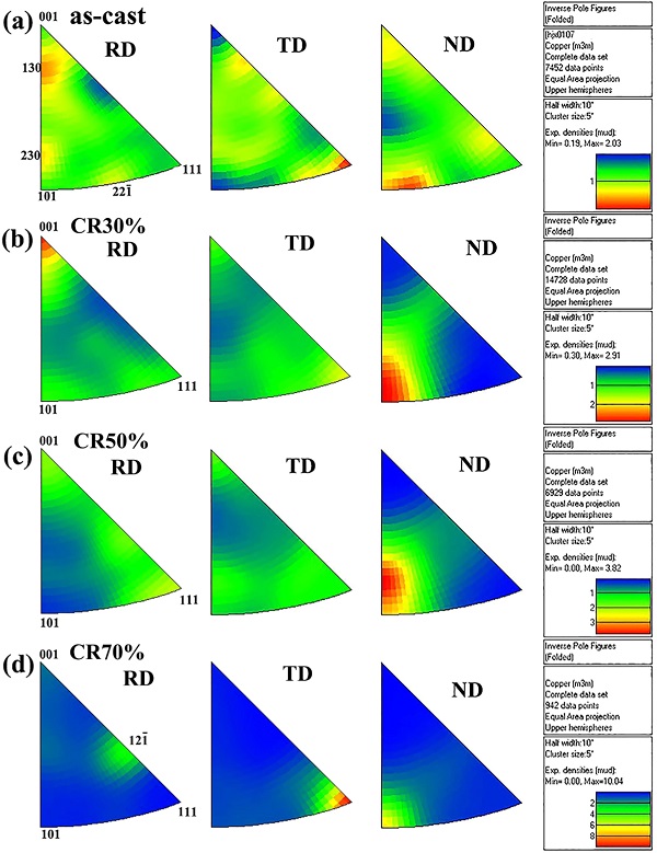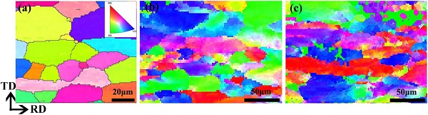 图中晶粒取向用不同颜色标定;横向为轧制方向,纵向为截面方向。铸态的等轴晶随轧制量增加而被逐渐拉长,同时取向也发生很大程度的变化。表明了冷轧能够改变晶粒取向、拉长晶粒尺寸并晶粒内部形成滑移带。