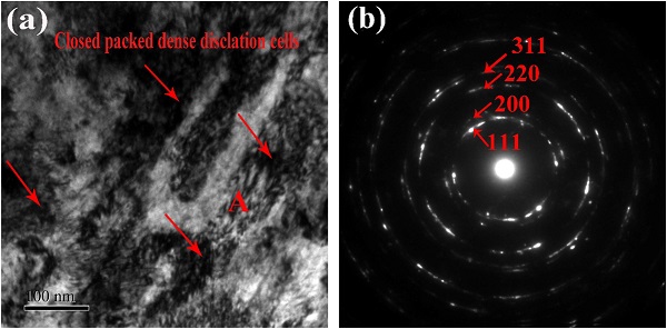 (a) 90%冷轧量下试样的TEM照片,其中A区域为FCC相结构;可以看到冷轧形成了大量密排的位错胞;