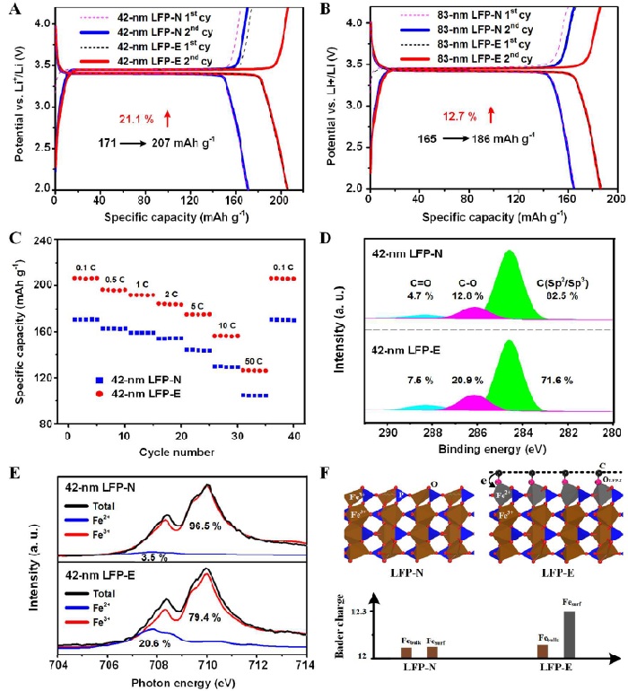 近日,来自北京大学深圳研究生院的潘锋教授在著名期刊Nano Letters上发表题为” Excess Li-Ion Storage on Reconstructed Surfaces of Nanocrystals To Boost Battery Performance”的文章。该文章报道了一种表面重构方法,以此减小LFP纳米晶体的缺陷,从而提高了锂离子电池的容量和倍率性能。通过独特的表面重构,LFP纳米晶体体现出具有尺寸效应的超容量性能。平均粒径为83nm和42nm的LFP可以表现出186和207mAh g-1的比容量(分别超出了170 mAh g-1理论值的9.4%和21.8%)。而且,基于LFP纳米晶体的复合物电极展示了良好循环稳定性和高倍率特性,10C电流密度下1000次循环容量损失只有0.3-1.1%,在50C倍率下电极仍然能表现出114mAh g-1/127mAh g-1的充/放电容量。实验和理论计算揭示了额外的容量来源于通过C-O-Fe键重构LFP表面的额外锂离子存储,该键可以通过补偿表面Fe的破缺对称来获得在重构表面上的两种额外锂离子存储位点,以此增强表面锂的束缚能。该超容量现象在LiFe1-xMnxPO4(0≤x≤1)和LiFe1-xCoxPO4(0≤x≤1)材料中均有发现。