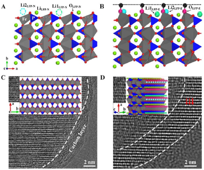 (a-b) 锂与电子转换和额外锂原子在LFP-N和LFP-E结构中的的插入位点;