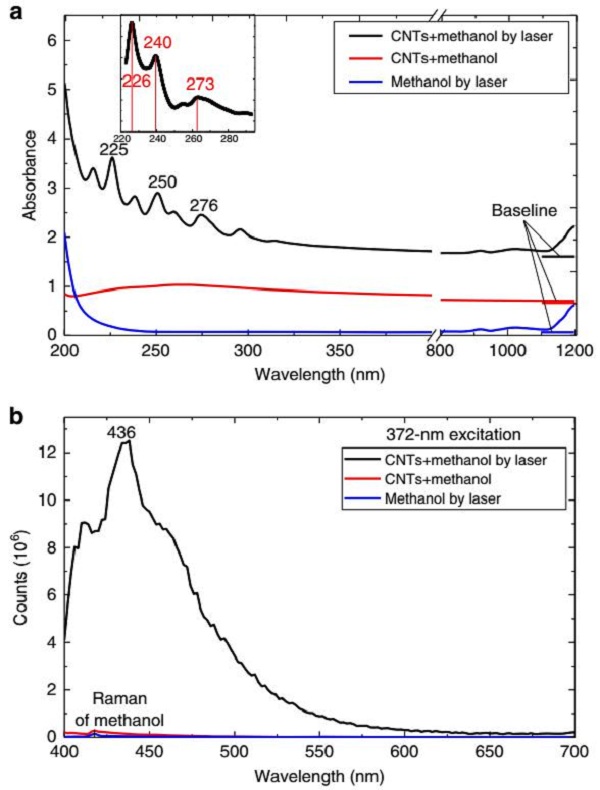(a)T-碳(黑色)、原始碳纳米管悬浮液(红色)和甲醇辐照产物(蓝色)的UV-Vis吸收谱。插图为模拟吸收谱线;