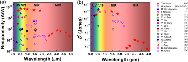 (a) 硅量子点和石墨烯杂化结构的光探测器的响应度随波长的变化。红色星号为本工作的结果。