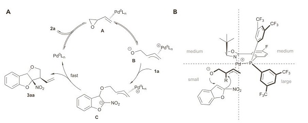 一个合理的催化循环(A)和用于环加成过程(B)的立体控制的模型