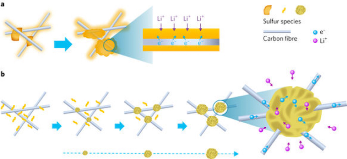 (a) 采用传统的熔融-扩散封装方法时,含硫物种通过二维表面上的电化学反应机制产生均匀连续的S/Li2S绝缘层(MD-Encap-S/CF),阻碍了电极/溶液界面的电荷转移过程。