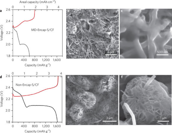 分析:对比图(a)和图(d)可知,用传统封装方法制备的MD-Encap-S/CF正极质量比容量仅为600 mAh/g,面容量为1.485 mAh/cm2,硫利用率仅为35%,并在循环充放电过程中伴随有明显的放电平台下降及容量衰减。而采用本文提出的电还原方法则能将Non-Encap-S/CF正极的硫利用率提高到接近100%,其质量比容量高达1632 mAh/g,面容量高达3.79 mAh/cm2,并显著降低了循环充放电过程中的过电势。