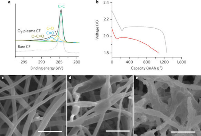 (b) 分别在O2等离子体处理前、后的碳纤维表面用非封装的电还原方法沉积Li2S,图为所得电极的第一次充放电曲线,其中灰色曲线为未经O2等离子体处理的电极,红色曲线为经过O2等离子体处理后的电极。