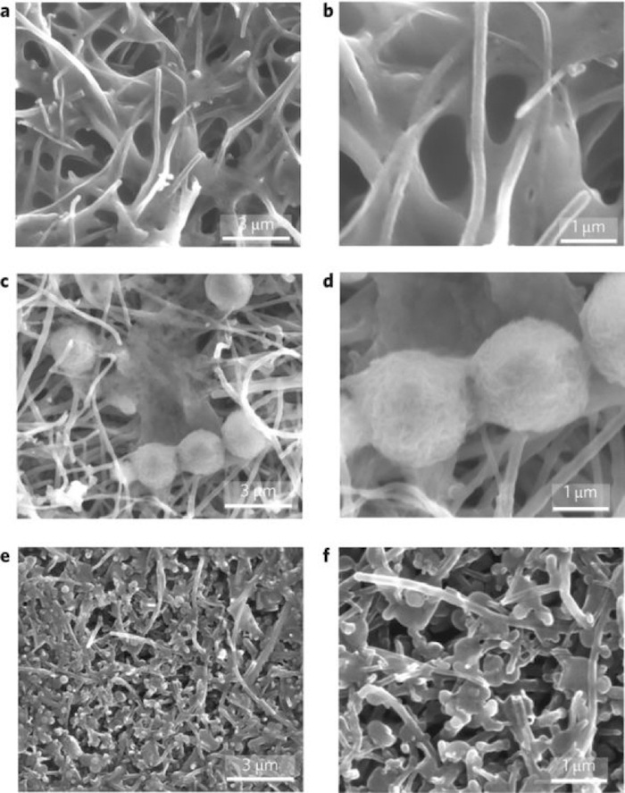 (d,e) 在O2等离子体处理后的碳纤维表面电沉积Li2S,制得的电极经(d) 浅放电;(e) 深放电后的SEM图像。充放电倍率为0.1C,图中标尺为1μm。