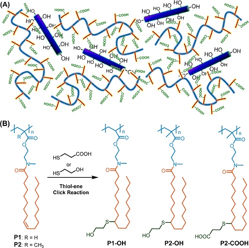 近日,安徽农业大学汪钟凯教授与南卡罗来纳大学唐传兵教授(共同通讯作者)等人在Macromolecules期刊上发表题为“Supramolecular Polymer Nanocomposites Derived from Plant Oils and Cellulose Nanocrystals”的文章。文中报导了通过超分子方法由大豆油(SO)及纤维素纳米晶(CNCs)制备具有刺激响应行为和较高机械强度的生物基高分子纳米复合材料的研究工作。在复合体系中,从SO获得的聚合物基质通过点击化学反应被修饰以羟基基团与羧基基团,这些基团与CNCs间形成较强的氢键作用,有效提升了纳米复合材料体系中基质与填料的相容性。制备得到的纳米复合材料表现出较高的拉伸强度,其储能模量在200℃的高温下仍然能够维持稳定。此外,这些纳米复合材料的机械强度显示出对水的快速可逆刺激响应,从而可实现利用外部刺激调节复合体系中的分子间氢键作用。