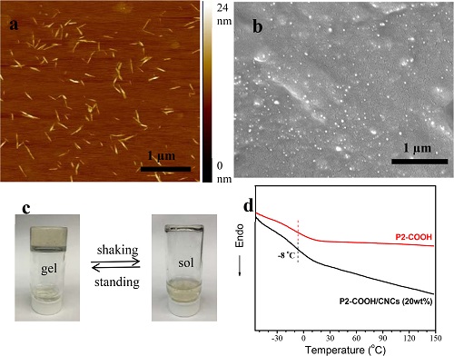 图3:对CNCs、P2-COOH、含20 wt%CNCs的P2-COOH/CNCs纳米复合材料的表征。