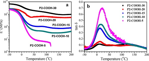 (a)含5-30 wt% CNCs的P2-COOH/CNCs纳米复合材料的储能模量随温度的变化;
