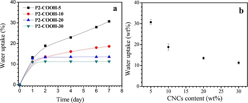 (a)室温环境下含5-30 wt% CNCs的P2-COOH/CNCs纳米复合材料的吸水率随浸入去离子水中的时间的变化;