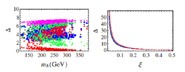 左:调整Δi为不同的输入参数xi,c+R(黑色),c+L(蓝色),f(红色),Ms(绿色)和mρ(玫红色)作为的mh的函数的散点图。右:调整Δm作为ξ的函数,希格斯粒子的质量mh=125 GeV。红色实线是Δm的解析表达式。