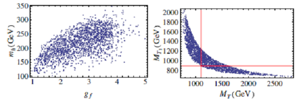 希格斯粒子质量作为g(左)的函数和Mt(右)的函数的散点图。