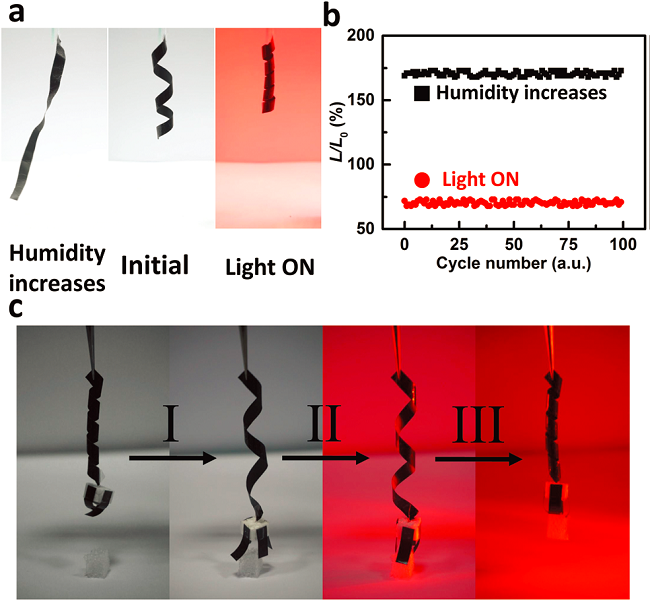 (a)螺旋型致动器在高湿度(左图),初始状态(中图)以及近红外光照射下(右图)的光学照片;