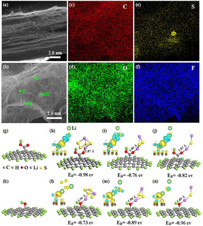 该团队进一步研究了锂硫电池正极中的粘结剂(Nano Energy, 2017, 31, 568-574),通过氢键作用,将PAA粘结剂嫁接到RGO表面,制备得到导电的GO-PAA粘结剂:RGO主要提高了功能粘结剂的电子电导;PAA能够与溶解的多硫化锂形成化学键,化学吸附向负极扩散的多硫化锂,从而改善锂硫电池的循环稳定性。