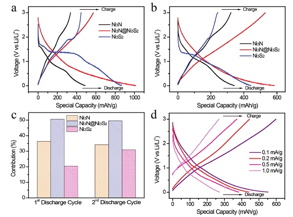 (a)Ni3N,Ni3N@Ni3S2,Ni3S2的首圈充-放电曲线;