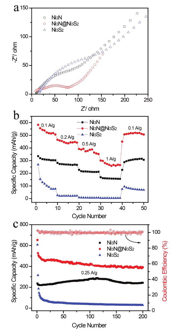 本文借助氮化-硫化处理制备得到电化学性能优异的Ni3N@Ni3S2纳米复合电极材料。复合材料有机结合了Ni3N优异的赝电容特性和Ni3S2的扩散控制型容量,有效提高了电极材料的储锂容量和倍率性能。界面处的晶格失配为复合材料提高了更多的活性储能位点。赝电容特性为复合材料提供了额外的储锂容量。巧妙设计的复合材料为电化学储能器件的开发与设计提供了更加多元化的借鉴。