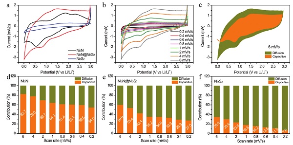(d)不同扫描速率下,Ni3N,Ni3N@Ni3S2,Ni3S2中电容性容量对总容量的贡献率对比图。