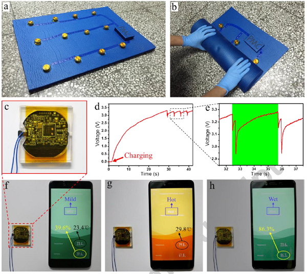 该工作展示了一个复合发电机,包括一个TENG和一个EMG,用来收集火车的振动能量,以持续地为无线智能传感器供电。无线智能传感器可以将数据传输到手机上,显示温度和湿度。更重要的是,MPNG还可以为照明提供电力,作为应急电源。这种设计的MPNG有可能在没有外部电源的情况下进行无线监控,尤其是在列车监控系统中。