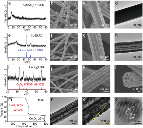 a-d) Co(Ac)2/PAN/PS; e-h) Co@LRC; i-p) CoS2@LRC。
