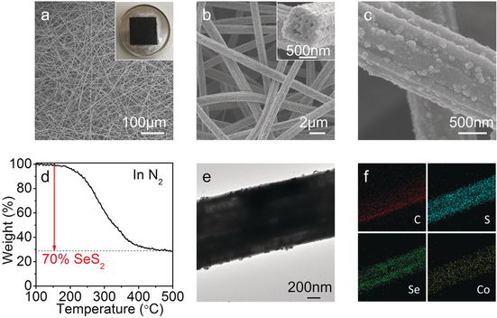a-c) CoS2@LRC/SeS2电极的FESEM表征,图a内部是CoS2@LRC/SeS2电极的照片,图b内部是CoS2@LRC/SeS2电极的截面FESEM图;