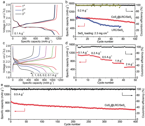 a) CoS2@LRC/SeS2电极的电压分布曲线,电流密度为1A/g;