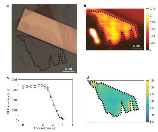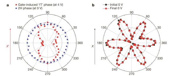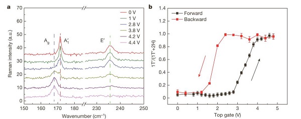 北京时间2017年10月12日,Nature在线发表了加州大学伯克利分校张翔教授(通讯作者)等人题为“Structural phase transition in monolayer MoTe2 driven by electrostatic doping”的文章,该团队报道了单层二碲化钼(MoTe2)由静电掺杂驱动六方晶相和单斜相之间的相变实验演示。实验发现相变出现拉曼光谱中的滞后环,并且可以通过增加或减小栅极电压来反转。结合二次谐波光谱与偏振拉曼光谱分析发现,相变后的单斜晶相保留了原始六方晶相的晶体取向。此外,更重要的是,整个实验样品均产生了结构相变。该研究成果使得理论在实验中得到证实,由静电掺杂驱动的结构相变为开发基于原子薄膜的相变器件开辟了新的可能性。