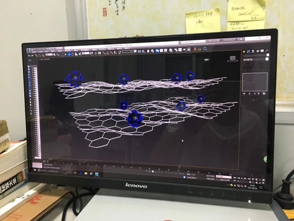 图1-5 用3DsMAX软件绘制的石墨烯表面负载纳米粒子的模型