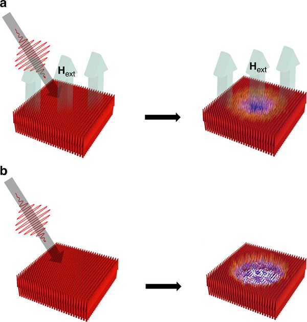 (b) 样品在零外磁场下的退磁状态。灰色箭头表示激光脉冲传播方向