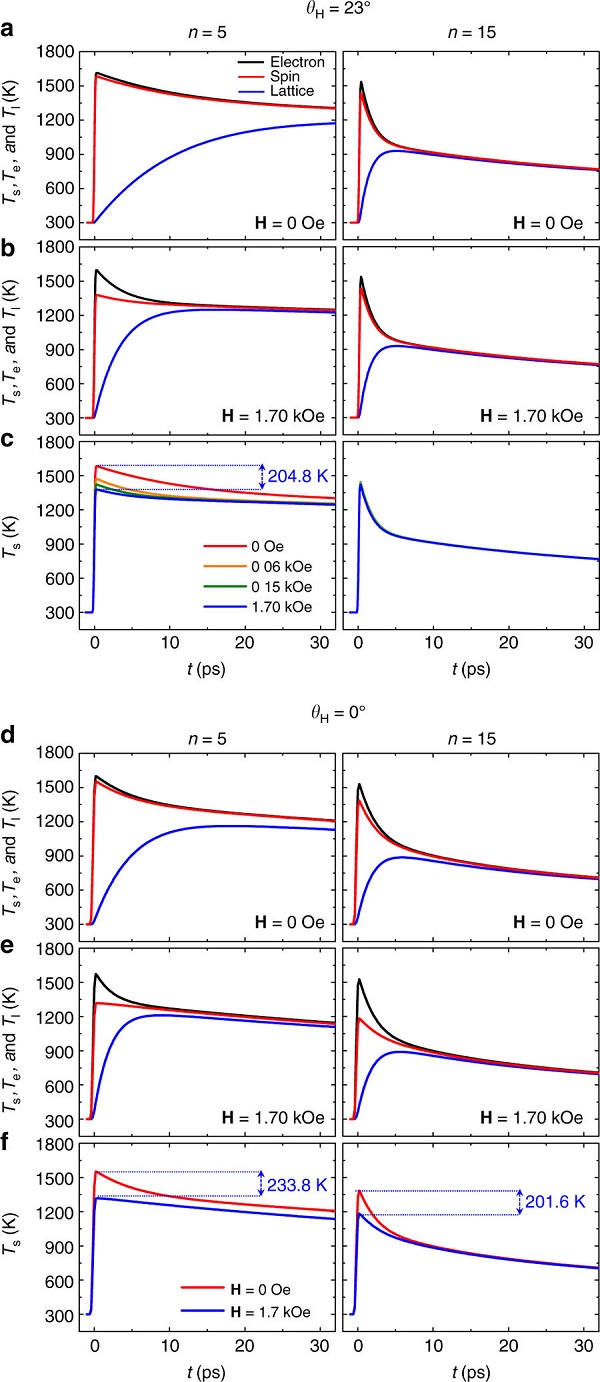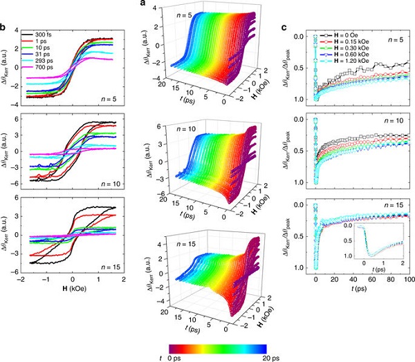 近日,韩国忠北大学Dong-Hyun Kim和浦项HTH官网地址 大学Dong Eon Kim(共同通讯作者)在Nat. Commun上发布了一篇题为“Ultrafast giant magnetic cooling effect in ferromagnetic Co/Pt multilayers”的文章。在该文章中研究人员对激光能量密度的系统变化以及外场强度和方向的时间分辨磁光响应进行了广泛分析,从而发现在光诱导退磁和再磁化过程中,Co / Pt纳米多层材料在飞秒时间范畴内存在巨磁冷却(高达200 K)现象,其中无序自旋排列更快,通过多层体系中的晶格-自旋相互作用从而磁冷却。
