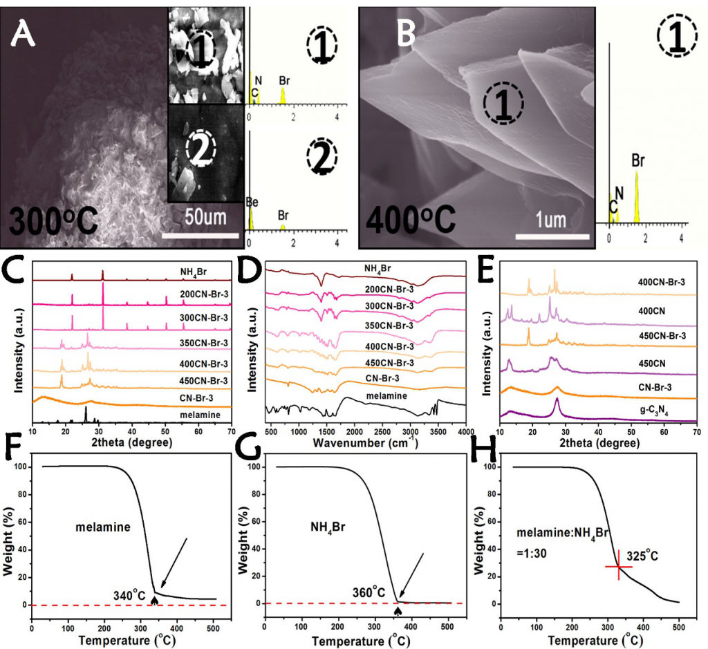 (A)三聚氰胺/ NH4Br(摩尔比1:30)在300℃煅烧后SEM图像和不同区域的EDS谱;