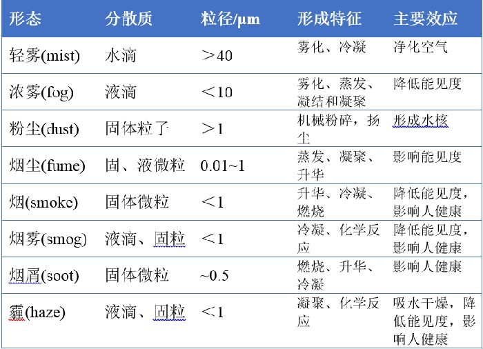 气溶胶(aerosol)又称气胶、烟雾质,是指固体或液体微粒均匀地悬浮于气体介质中形成的分散体系。由于粒子比气态分子大而比粗尘颗粒小,因而它们不像气态分子那样服从气体分子运动规律,但也不会像粗尘颗粒那样受地心引力作用而沉降,具有胶体性质,故称为气溶胶。根据颗粒物的物理状态不同,可将气溶胶分为以下三类:(1)固体气溶–烟和尘;(2)液态气溶–雾;(3)固液混合态气溶–烟雾。表1给出了气溶胶形态及其主要形成特征。