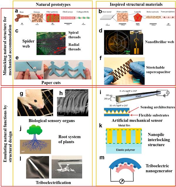 在过去的二十年中,柔性电子器件领域已取得令人兴奋的进步,有望在未来人类生活中引发一场革命。然而,由于在复杂应力环境中活性材料较差的可持续性,构建柔性器件已有了新的需求。因此,通过自然选择发展出各种环境适应性结构和材料的天然材料分级体系结构可启发研究人员解决材料和工程技术的局限性。南洋理工大学陈晓东教授(通讯作者)等综述了受天然材料启发的结构材料智能设计及其在构筑柔性器件中的应用。作者首先总结了能适应机械变形的结构材料,适应机械变形是柔性器件能在复杂的环境中正常工作最基本的要求。之后,作者讨论了受自然启发的结构材料的柔性器件的功能,包括机械传感、能量采集、身体互动等等。最后,作者为开发新结构材料及其在未来柔性器件中的潜在应用以及仿生功能的前瞻策略提供了一种思路。