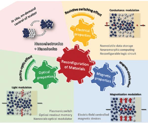 由于半导体行业的飞速发展已接近基本物理极限,并面临着严重的性能和成本约束,因此多功能材料和器件正在向新型智能和高效的计算系统转化。通过控制固态薄膜的内部离子分布,在室温下对其施加外加电场后,材料的化学成分和物理性质将在器件制备后可逆地重新配置。在不少材料中均可观察到重构性,包括常用的介质薄膜,这可用于开发新器件,如可变电阻式存储器。物理重构性可进一步将记忆和逻辑运算合并在同一设备中以进行高效内存中计算和神经形态计算。通过直接改变材料的化学成分还可以耦合电、光、磁效应。密歇根大学卢伟教授(通讯作者)等对纳米材料重构领域的最新进展进行了综述,介绍了基本材料和设备的研究,揭示了动态离子过程,讨论了系统建模、器件和材料的挑战以及未来的研究方向。