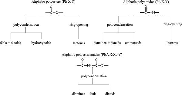 图5 脂肪族聚酯、聚酰胺和聚酰胺酯的合成方法和底物
