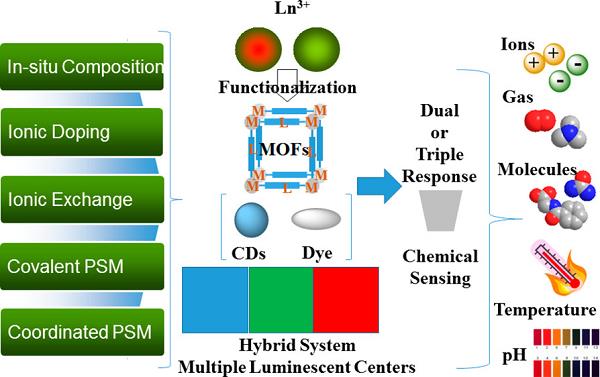 由于金属有机框架(MOFs)特殊的结构可调性和性能,相比其他化学感应材料具有一定优势。MOFs包含具有特殊化学反应的多用模块(连接体或配体),因此合成后修饰(PSM)为开发和扩大其特性提供了可能。光活性镧系离子(Ln3+)引入MOF的主体可在MOF连接体的不同位置产生新的发光信号。独特发光中心的性质可能使得对敏感物种的反应产生变化(如比率感应),这为发光研究与化学传感应用提供了新的机会。同济大学闫冰教授(通讯作者)对用于多重发光中心化学传感的镧系功能化MOF复合材料的最新研究进展进行了综述。作者首先提出镧系离子、化合物或其他发光物种(有机染料或碳点)功能化MOF主体和基于镧系功能化MOF光功能复合体系组装的通用策略,主要用到了五种方法:原位复合、离子掺杂、离子交换、共价合成后修饰、配位合成后修饰。之后介绍了镧系功能化MOF复合材料在温度传感、pH传感以及食物品质、空气污染物检测方面的应用。