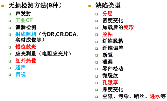 各种无损检测方法与可检测缺陷的对应关系,出自ASTM 2533-09 宇航用高分子基复合材料无损检测指南