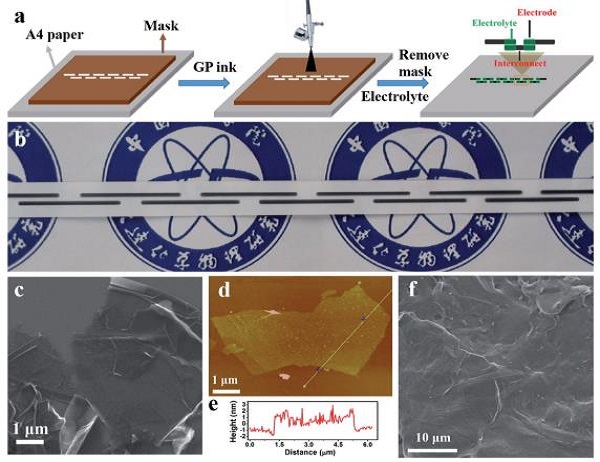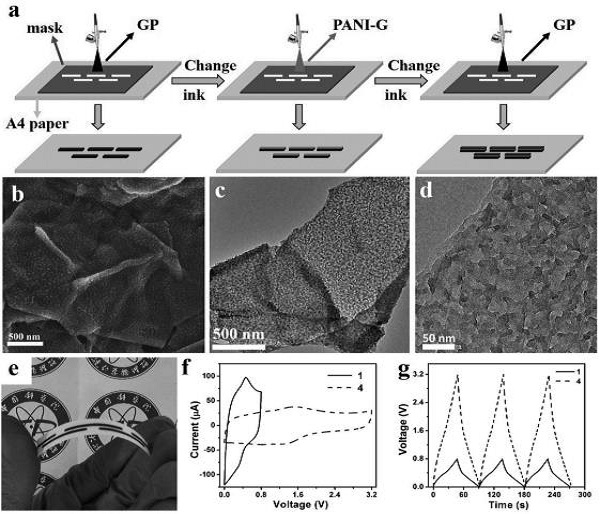 研究团队使用电化学剥离石墨烯和导电聚合物PH1000(聚3,4-乙烯二氧噻吩-聚苯乙烯磺酸)的混合分散液作为高导电墨水,在掩模板的辅助下,采用喷涂的方法在A4纸上制备出由十个线形器件自串联集成的平面超级电容器模块,所得器件具有良好的机械柔韧性,在水系电解液中可稳定输出8V的高电压,且无需借助于金属连接体。为提高单个器件的比容量,使用高容量的聚苯胺功能化的石墨烯作为电极材料,同样制造出的线形串联超级电容器,具有高的赝电容且保持了良好的串联行为。为进一步提高单个器件的输出电压,选择二氧化锰纳米片和电化学剥离石墨烯两种二维材料,分别作为超级电容器的正负极,在一个基底上制造出了不对称的线形串联超级电容器,使输出电压由单个不对称超级电容器的1.8V拓展到3个线形串联超级电容器的5.4V,进一步提高器件的输出电压和能量密度。研究表明,石墨烯和其它二维材料在制造具有对称和不对称结构的线形串联超级电容器中具有广泛的适用性,并为制造平面化、柔性化、集成化储能器件提供了新策略。