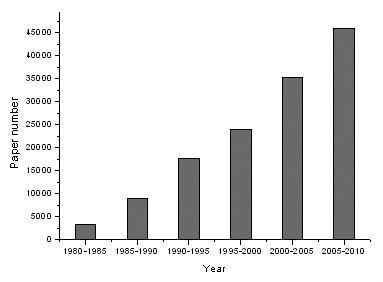 流式细胞术是一种对快速直线流动状态中的单列细胞或生物颗粒进行逐个、多参数、快速的定性、定量分析或分选的技术,具有检测速度快、测量参数多、采集数据量大、分析全面、分选纯度高、方法灵活等特点,已经成为近代科学研究中的热门专题,研究它的论文数量也在逐年上升(见图1)。流式细胞仪(flow cytometer,FCM)是以流式细胞术为核心技术,集光学、电子学、流体力学、细胞化学、生物学、免疫学以及激光和计算机等多门学科和技术于一体的先进科学技术设备。它被广泛应用于临床医学、细胞学、生物学、微生物学、制药学、生殖学等领域,是现代科学研究中的先进仪器之一,被誉为实验室的”CT”。