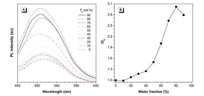 B 在THF /水混合物中相对PL强度与水含量的关系图。
