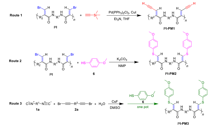 近期,秦安军教授和唐本忠院士(共同通讯作者)等人在Macromolecules上发表了一篇利用水作为共聚单体,构建聚合物的文章,题为“Facile Polymerization of Water and Triple-Bond Based Monomers toward Functional Polyamides”。文中介绍的以水为共聚单体进行聚合,不仅突破传统限制,而且提供了一条直接、新颖的新反应路线来制备聚酰胺。此外,所得聚酰胺可以容易地后官能化。聚合后修饰(PPM)可以有效地消耗预聚物上的反应性基团,以富集具有相同骨架的聚合物的功能。通过简单的Sonogashira反应和取代反应,可以方便地对聚酰胺进行后修饰。值得一提的是,通过取代反应进行的聚合后修饰甚至不需要纯化聚合物,可以采用“一锅法”进行。因此,该法提供了聚合物后功能化的便利平台,为其应用提供了广阔的前景。浙江大学张洁为第一作者。
