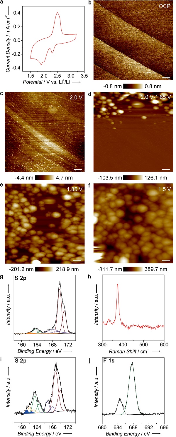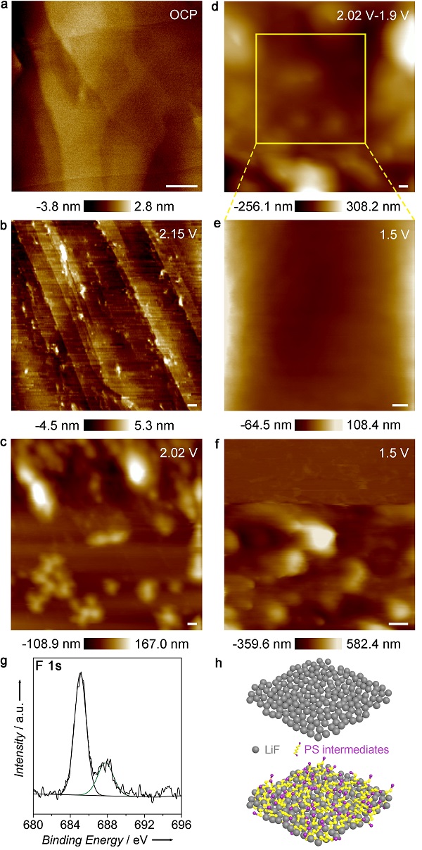 图1. Li/PS电池放电过程HOPG/电解液界面的原位AFM观察及产物表征