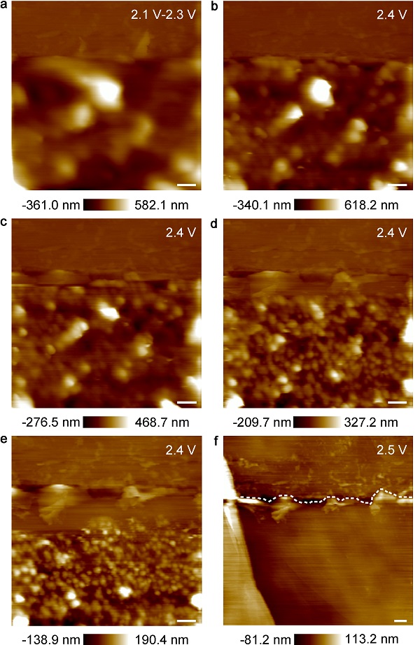 图3. Li/PS电池高温充电过程HOPG/电解液界面的原位AFM观察