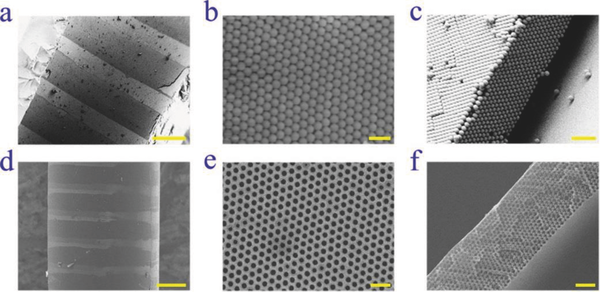 图2. 条纹图案胶体晶体及水凝胶复制纳米结构的SEM图像