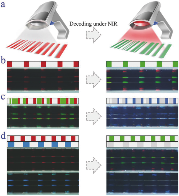 d)二维的条纹条形码,在近红外光照射时,颜色发生蓝移。