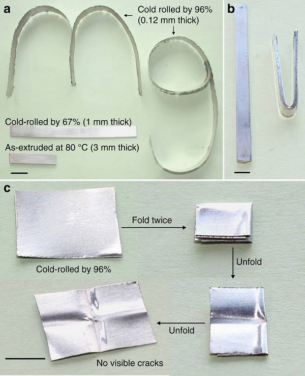 (c)在室温下对冷轧态的0.12mm镁箔进行两次对折,无肉眼可见的裂纹;图中标尺为5mm。