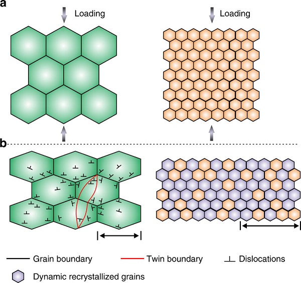 图5:在室温下压缩,细晶和粗晶样品的变形模式示意图