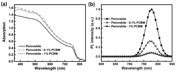 (a).钙钛矿、钙钛矿-0.1%PCBM和钙钛矿-1%PCBM的吸收谱;